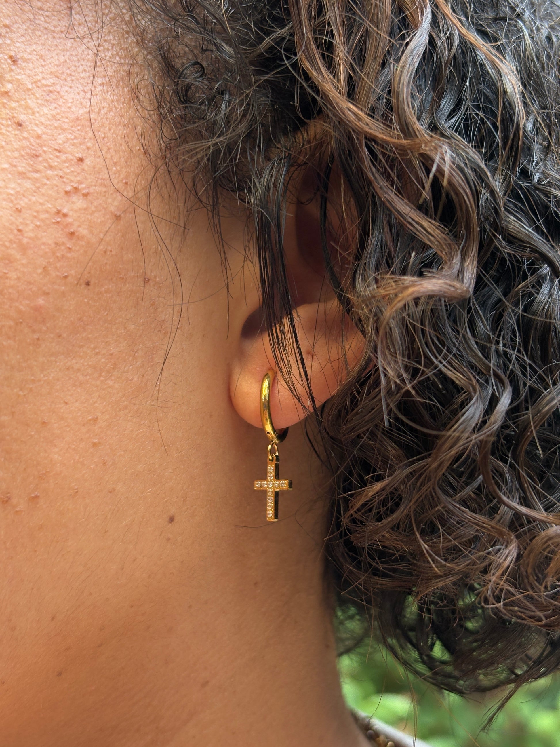 These drop earrings feature a sleek cross design that catches the light with every movement, adding timeless elegance and meaning to any outfit. Perfect for both everyday wear and special occasions.