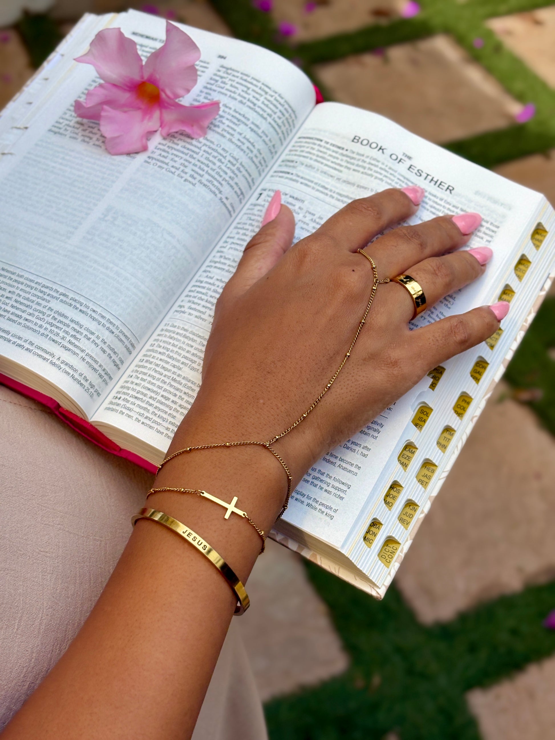 This beautifully crafted adjustable hand chain features a dainty cross that rests gracefully across the hand, symbolizing strength and devotion. Designed to add a subtle touch of luxury and meaning to any look, it’s perfect for both everyday wear and special occasions.